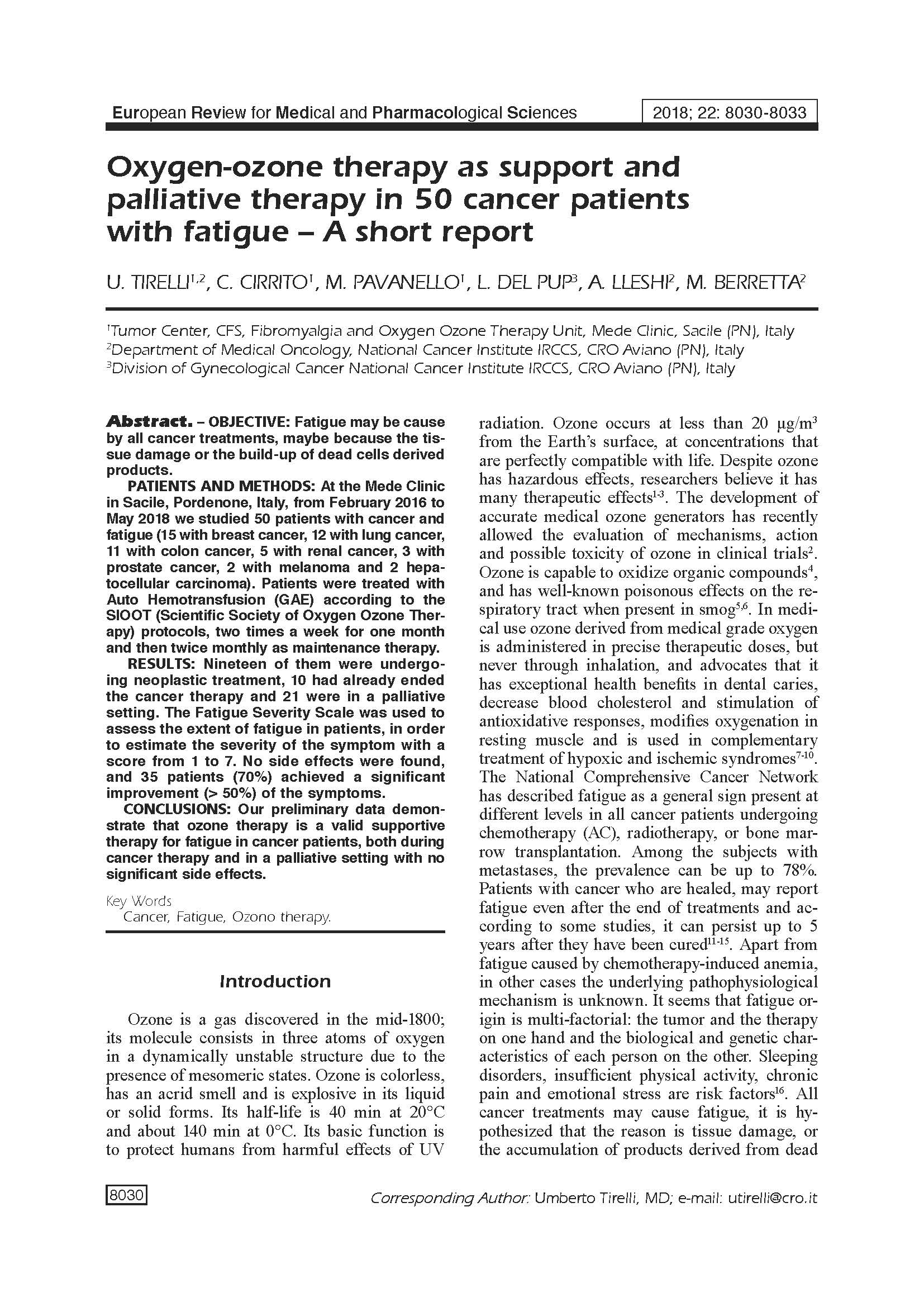 7. Tirelli U, Cirrito C, Pavanello M, Del Pup L, Lleshi A, Berretta M. Oxygen- ozone therapy as support and palliative therapy in 50 cancer patients with fatigue - A short report. Eur Rev Med Pharmacol Sci. 2018 Nov;22(22):8030-8033. doi: 10.26355/eurrev_201811_16432. PMID: 30536352.