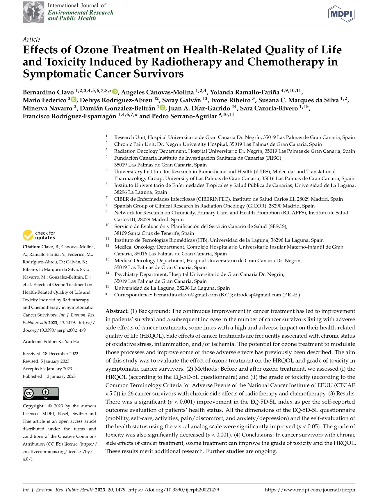 5. Clavo B, Navarro M, Federico M, Borrelli E, Jorge IJ, Ribeiro I, Rodríguez- Melcon JI, Caramés MA, Santana-Rodríguez N, Rodríguez-Esparragón F. Ozone Therapy in Refractory Pelvic Pain Syndromes Secondary to Cancer Treatment: A New Approach Warranting Exploration. J Palliat Med. 2021 Jan;24(1):97-102. doi: 10.1089/jpm.2019.0597. Epub 2020 May 5. PMID: 32379556.
